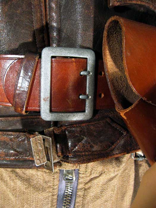 | In preparation for a mission, the Major has strapped on his officer grade belt with his issued sidearm. Pilots tended to carry small automatic pistols to fit in cramped cockpits. Also pictured is the locking built in belt for the jacket. |