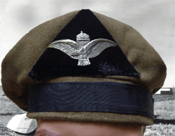 A close up view of the cap. This style was unique to the Hungarian Air Force. It is more similar in style to a Naval enlisted cap than air force or army. The badge is hollow stamped out of silver metal. The triangular background is some kind of velvet. The black ribbon (which is crudely sewn) denotes that the man was promoted after the hat was issued to NCO status. Other ranks would not have the black band.