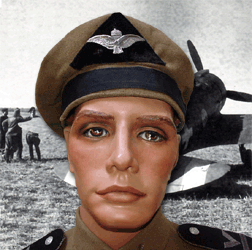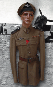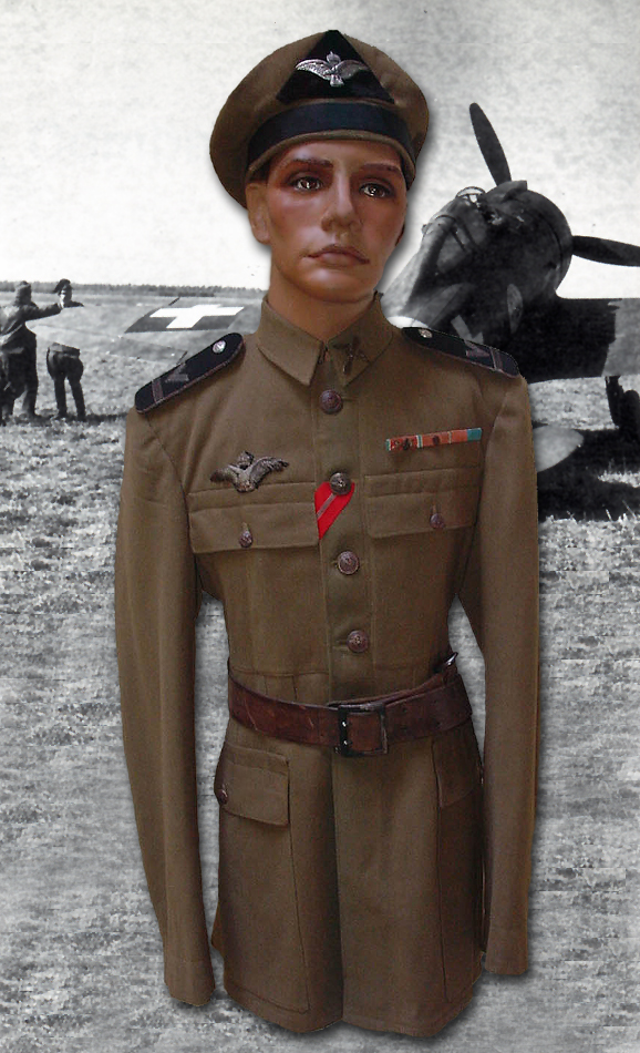 A Hungarian Air Force Sergeant in his service dress. He wears a tunic made out of a coarser wool than the officer's tunic. The color is somewhere between brown and olive. His rank is reflected in his cap eagle and shoulder stripes. His branch of service is denoted by his 'tural' cap badge and his propeller collars. He is rated as a pilot based on the silver wings on his chest. The plane in the background is a Hungarian marked Reggiane 2000 in the Spring of 1942.
