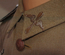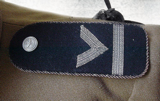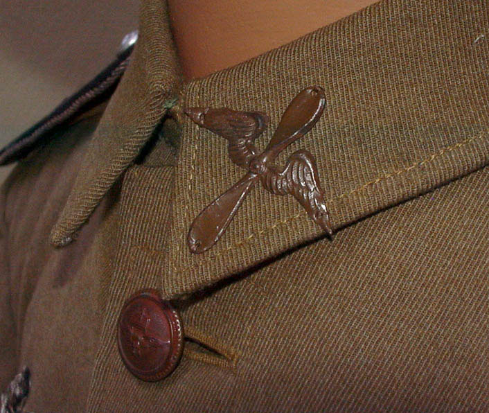 In this picture, we seen the really unique and stylized collar devices that denoted the air branch. Unfortuantely when we acquired this uniform, there was only one remaining. We are told they are very rare and hard to find. Hopefully one will turn up. The buttons are the same as that as the officers but in bronzed metal.