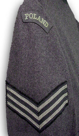 | The Polish Air Force sgt. collar rank. Made of gilt bullion lace sewn onto wool covered boards. This was worn with the RAF sgt. stripes on the right. |