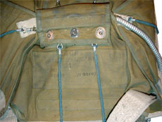 A close view of the seat pack parachute shows quartermaster and inspection marks. The elastic blue cords that pull open the chute are present but the elastic is gone. Interestingly, the cords are the same Air Force blue as the shoulder boards. This is an early style chute as the harness and catch are a simple clip and eye. |