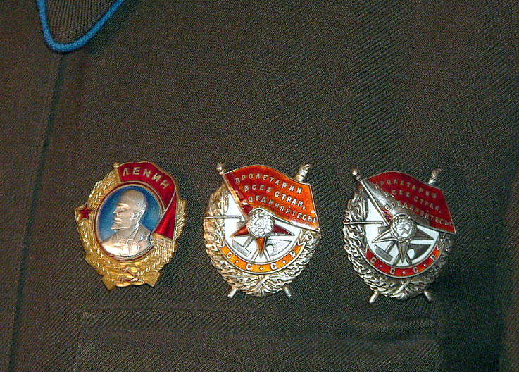| Like almost all Soviet uniforms, this one is unnamed and it is unclear who he owner was or what awards they might have earned. There are three clear holes and it is likely that they would have had these awards. These are the early screwback style of the Order of Lenin and two Orders of the Red Banner, |